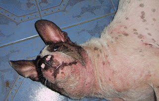 die tae sagt auch, so wie ich vermutet hatte, dass die schwellungen und beulen von demodex raeude kommen. er hat auch nun viele blutige grosse pickel, so wie sie ice auch hatte. die schwellung unter dem kinn ist zurueckgegangen, dafuer ist nun eine neue groessere beule an der seite entstanden :( dies sind entzuendungen des gewebes, bedingt durch die hautentzuendungen und vereiterungen.